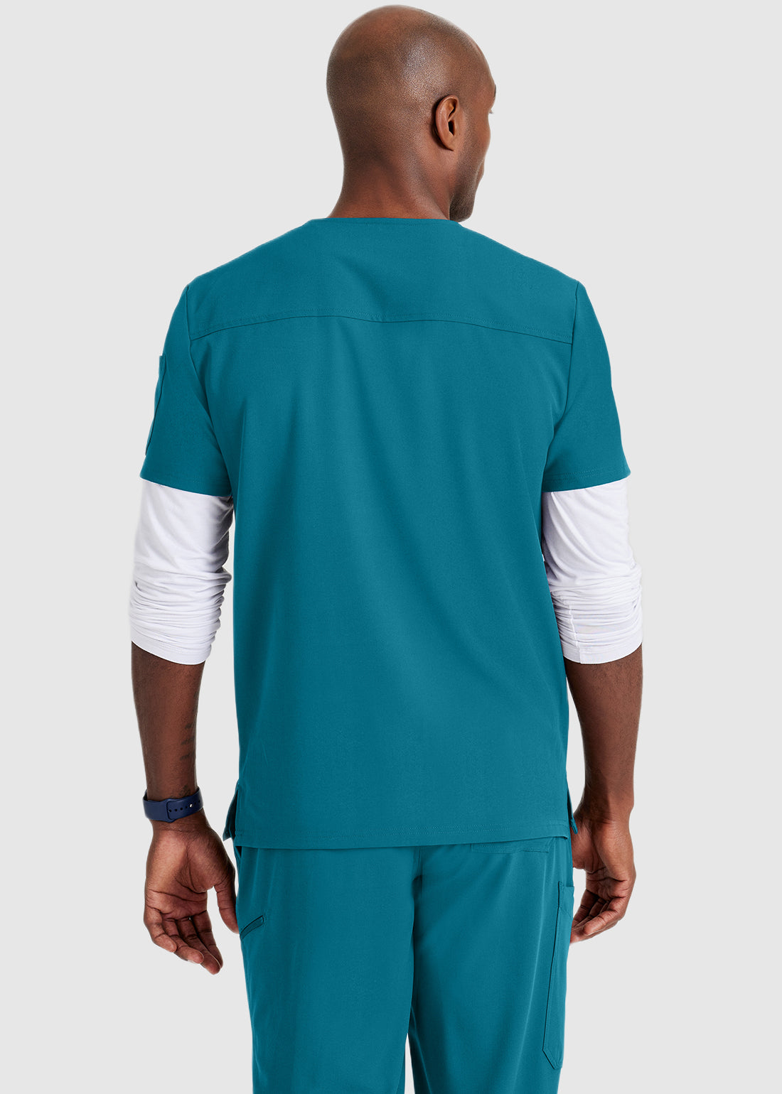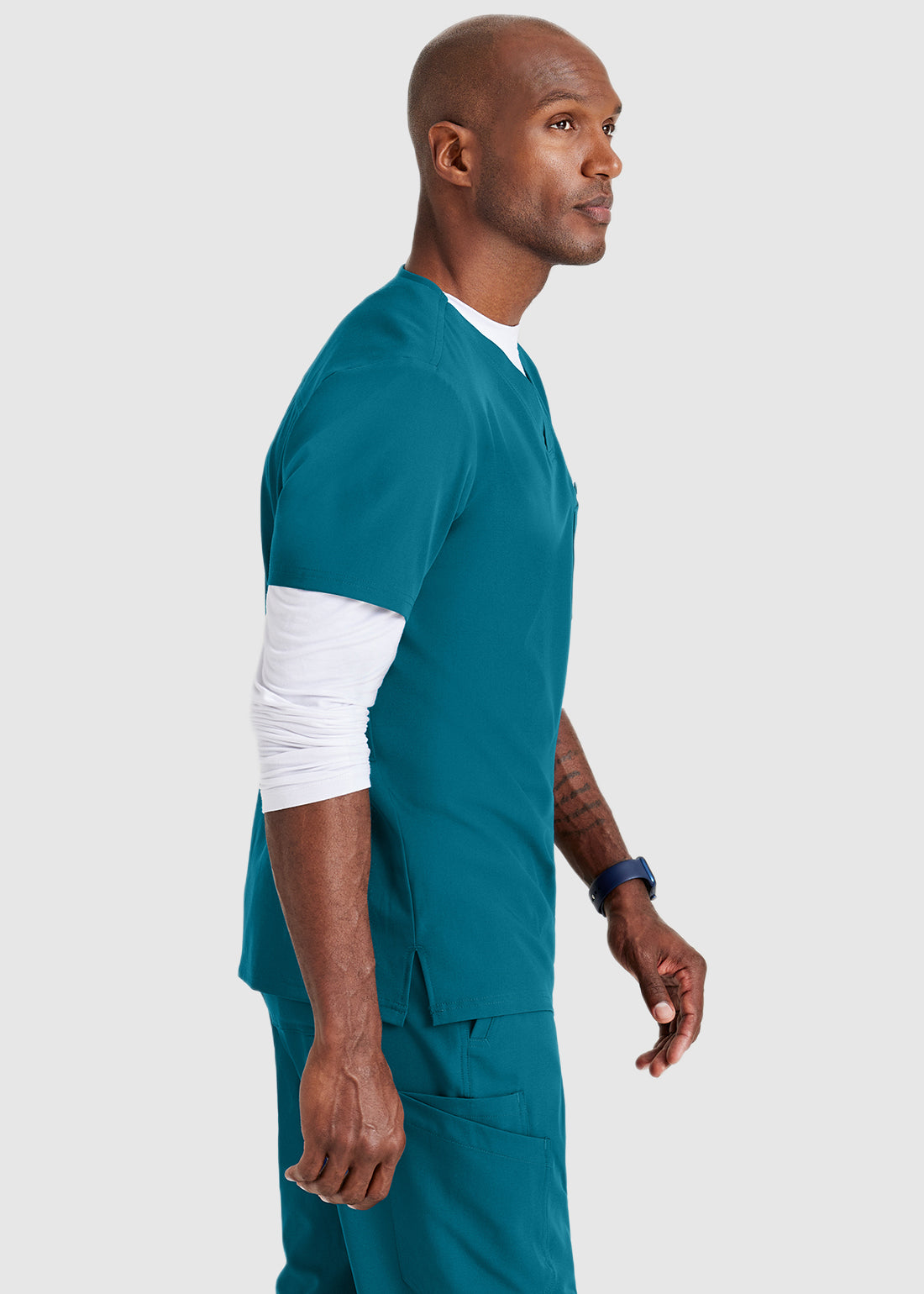 Durable and sturdy, the Barco Unify Men's V-Neck Scrub Top comes with a banded v-neckline featuring short sleeves, zip chest pocket and patch pocket with pen slots, sleeve pocket, shoulder badge loop, straight hem and side vents for your day to day needs.