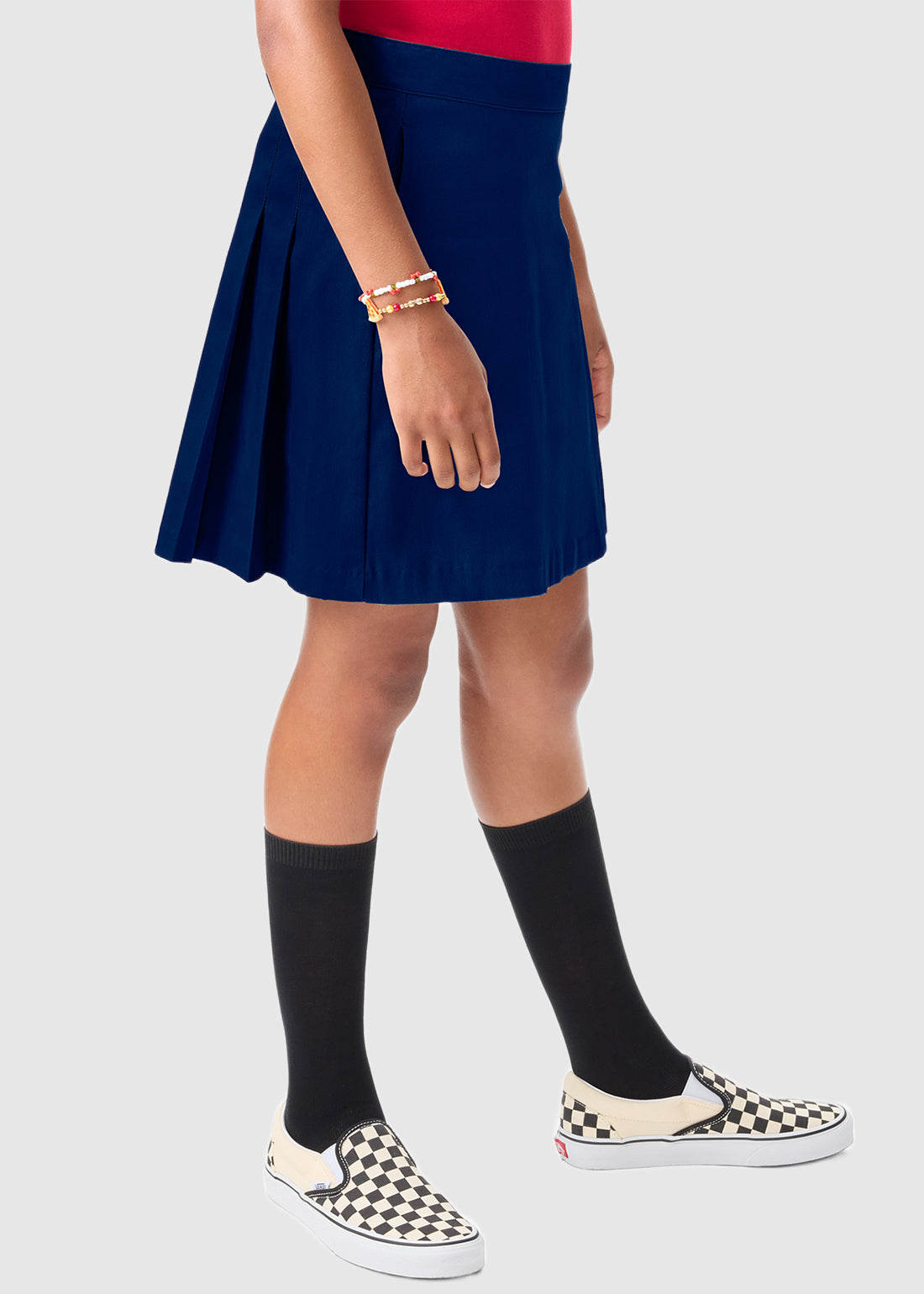 Made for you! The Classroom Uniforms 55274 Junior Stretch Double-Pleated Scooter. The junior stretch twill scooter with double-pleat detail in front and back, hidden side pocket, side zip closure and built-in poly knit shorts makes it a must have.