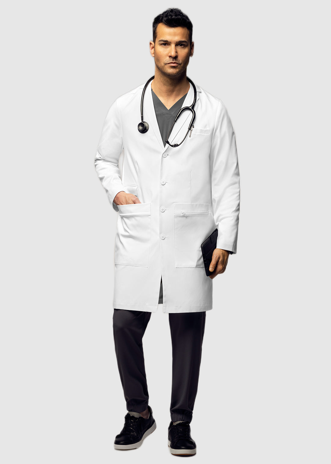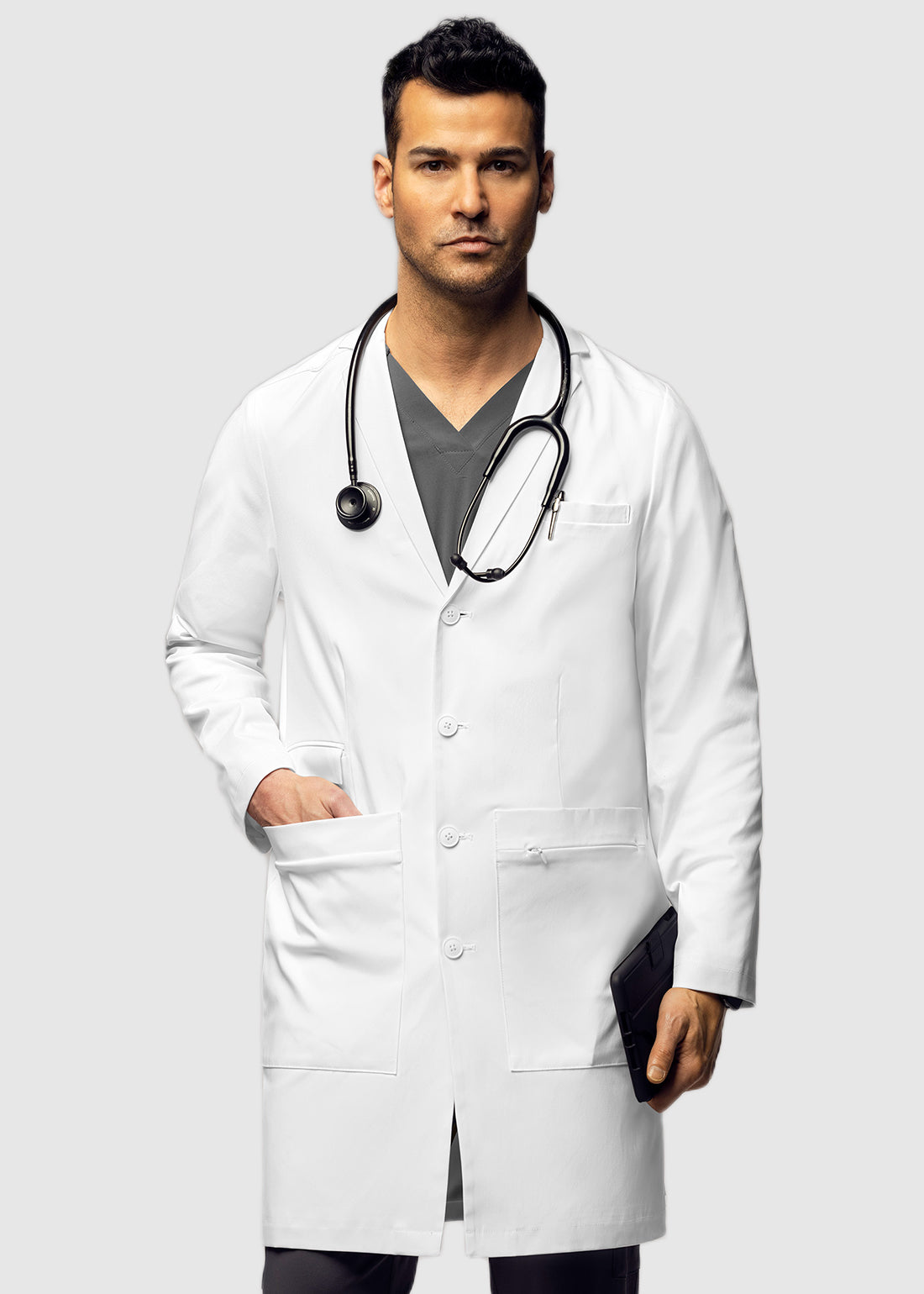 masculine and sturdy, the Wink Scrubs Wink Slate Men's Long 38 Inch Lab Coat comes with a Slim notched lapel and four matte white button closure, locker loop at inner back collar, badge loop at right shoulder, tailored sleeve seaming at back for greater range of motion in arms, side entry slits and front and back darting for superior shaping, and vented back, the lab coat is functional. Completed with modern fabric technologies, secure pockets for storage and a tailored suit like style, the lab coat is exactly what you need.