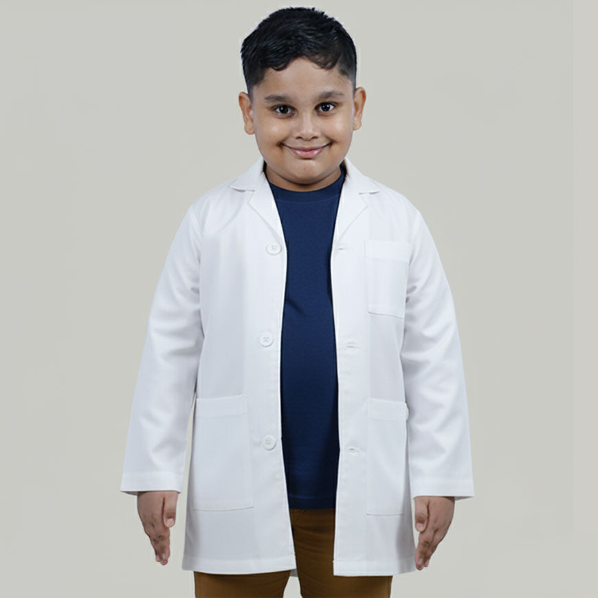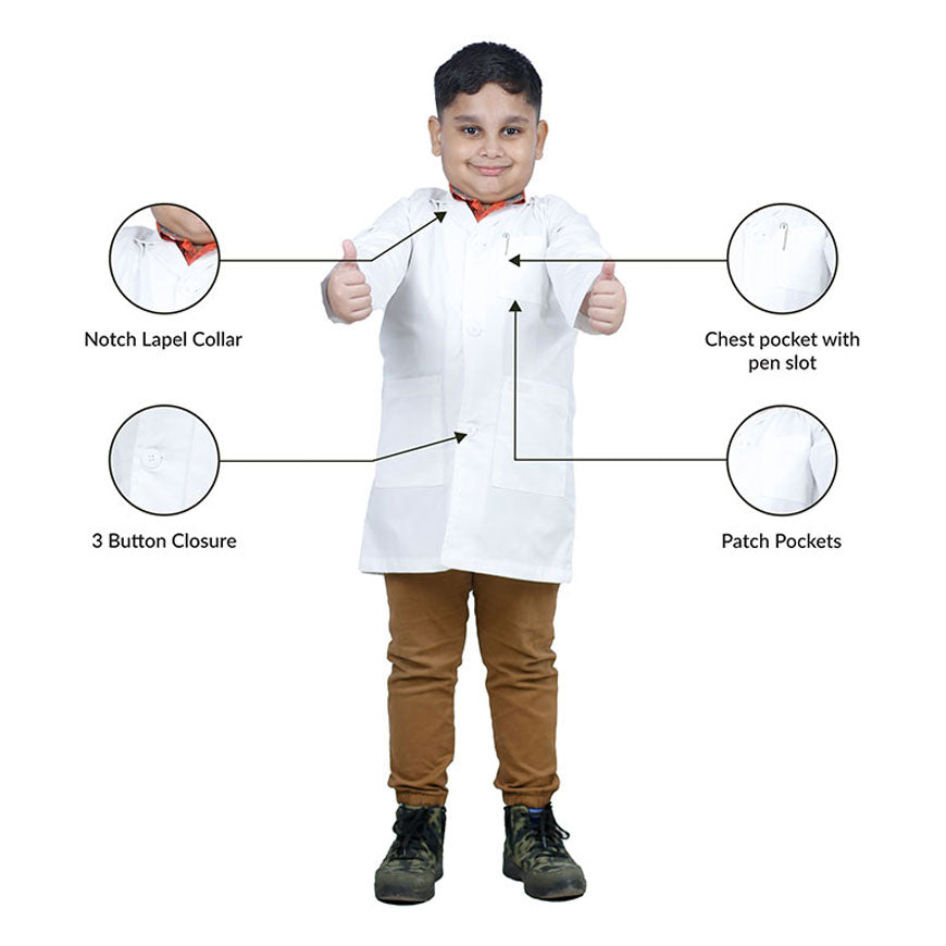 Give your kids an edgy and professional look with HeedFit Unisex Children White Lab Coat. Ideal for your science lab and wizardry, the lab coat is ideal for both - boys and girls. With a lapel collar featuring three button closure that is easy to wear, vented back that aids in movement and embroidery that enhances the look, the coat garners supreme functionality. Completed with two spacious patch pockets and one chest pocket for your tools and other personal belongings makes storage hassle free, you get quality, comfort and performance.