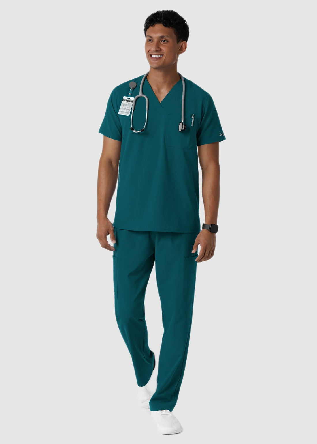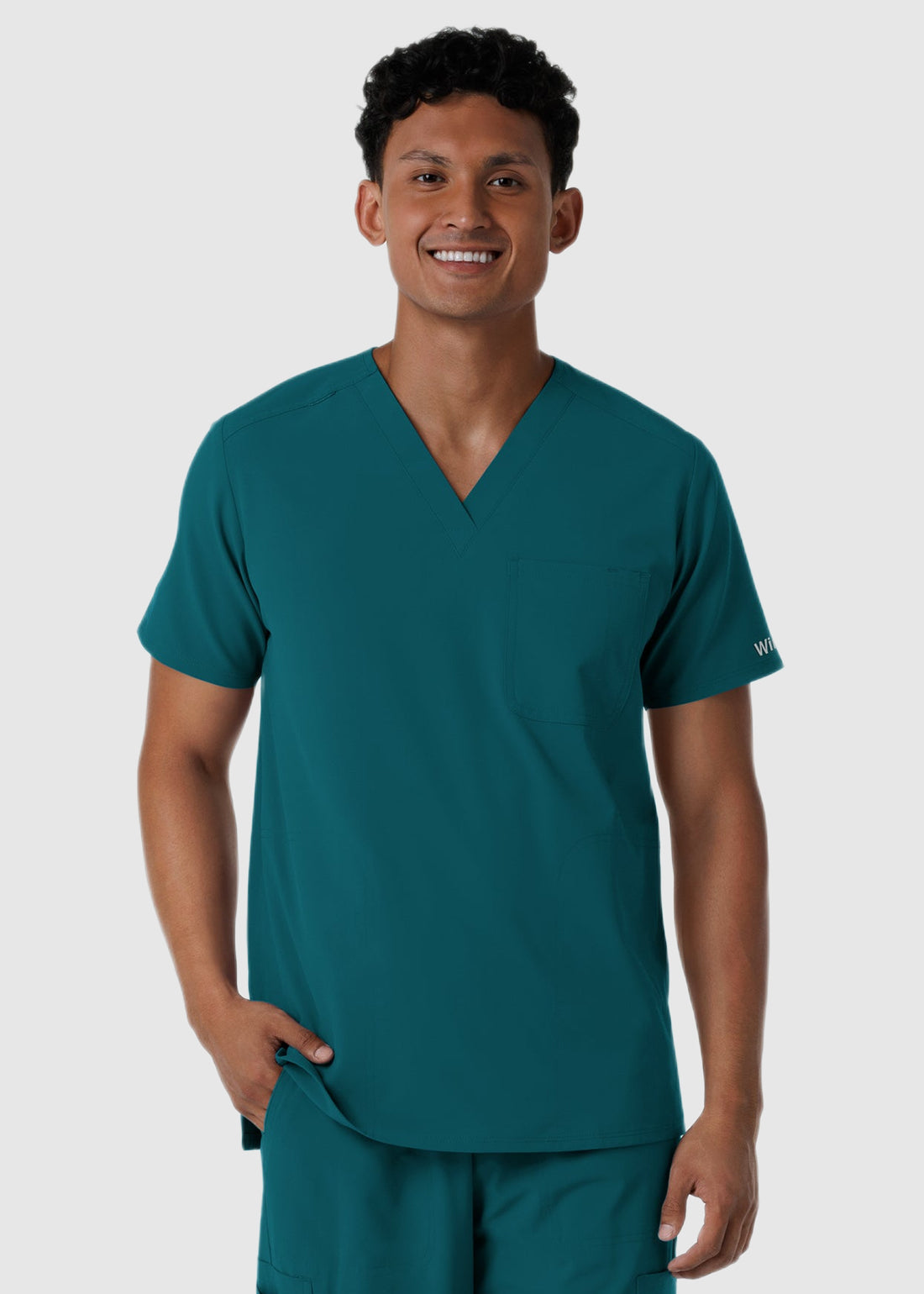 Wink Scrubs Nurtur Men's V-Neck Scrub Top offers a clean, modern look with its classic V-neck and shoulder badge loop. Designed with two side-entry pockets, a chest pocket with pen slot, and a center back seam, it delivers both style and everyday functionality.