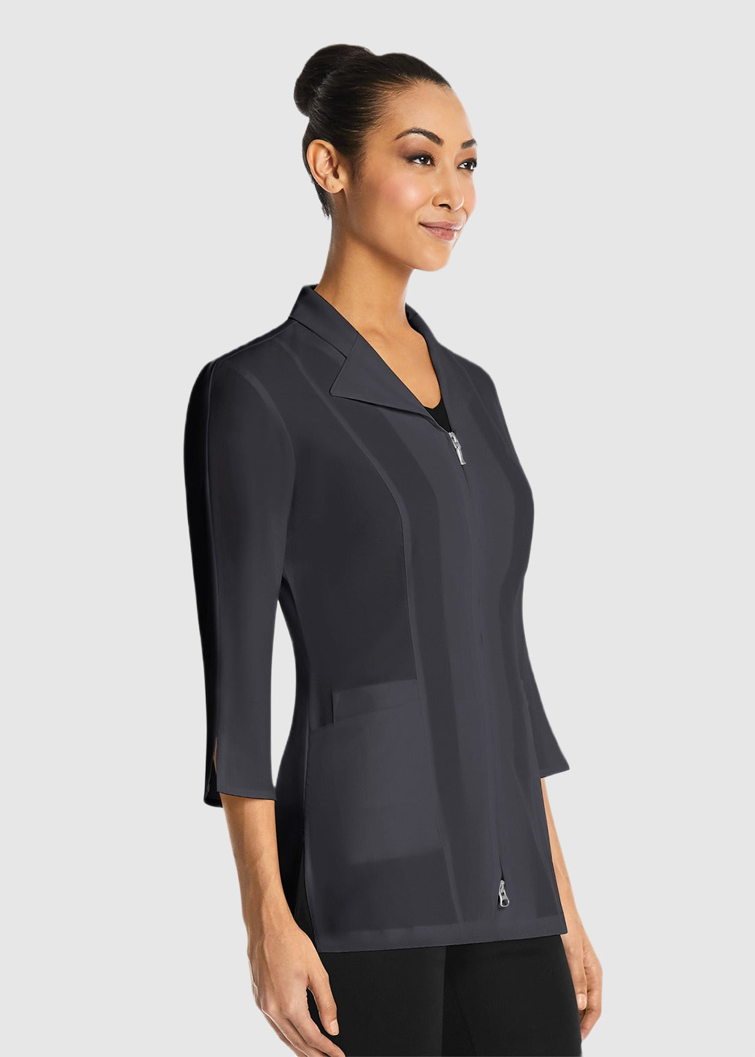 Make an impression with Maevn 8801 Three Quarter Sleeve Zip Smart Lab Jacket. The modern Lab jacket comes with a fashion collar, two way front zipper and front princess line for performance. Completed with two way front zipper and two front pockets with inner pockets, the jacket is a must have.