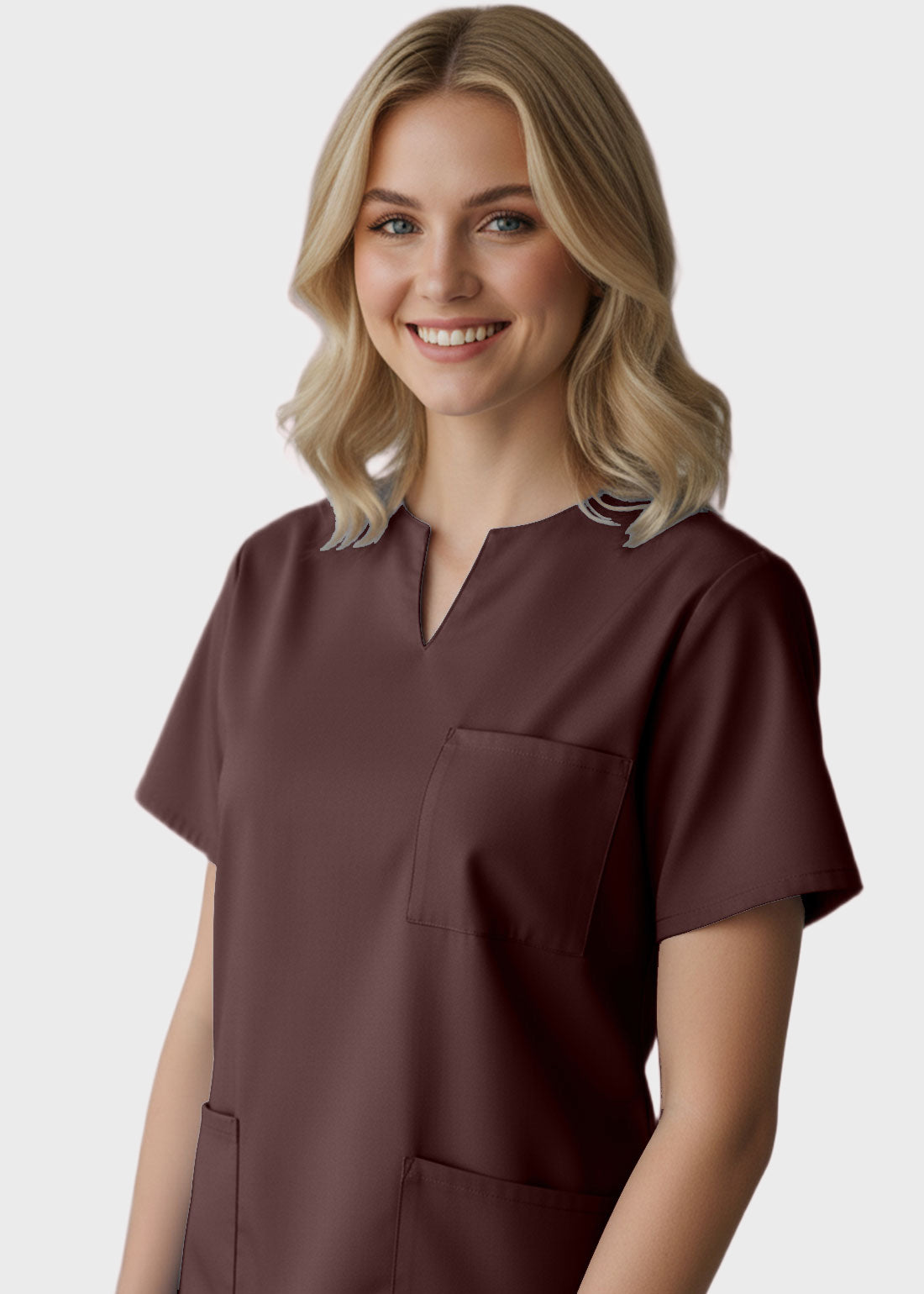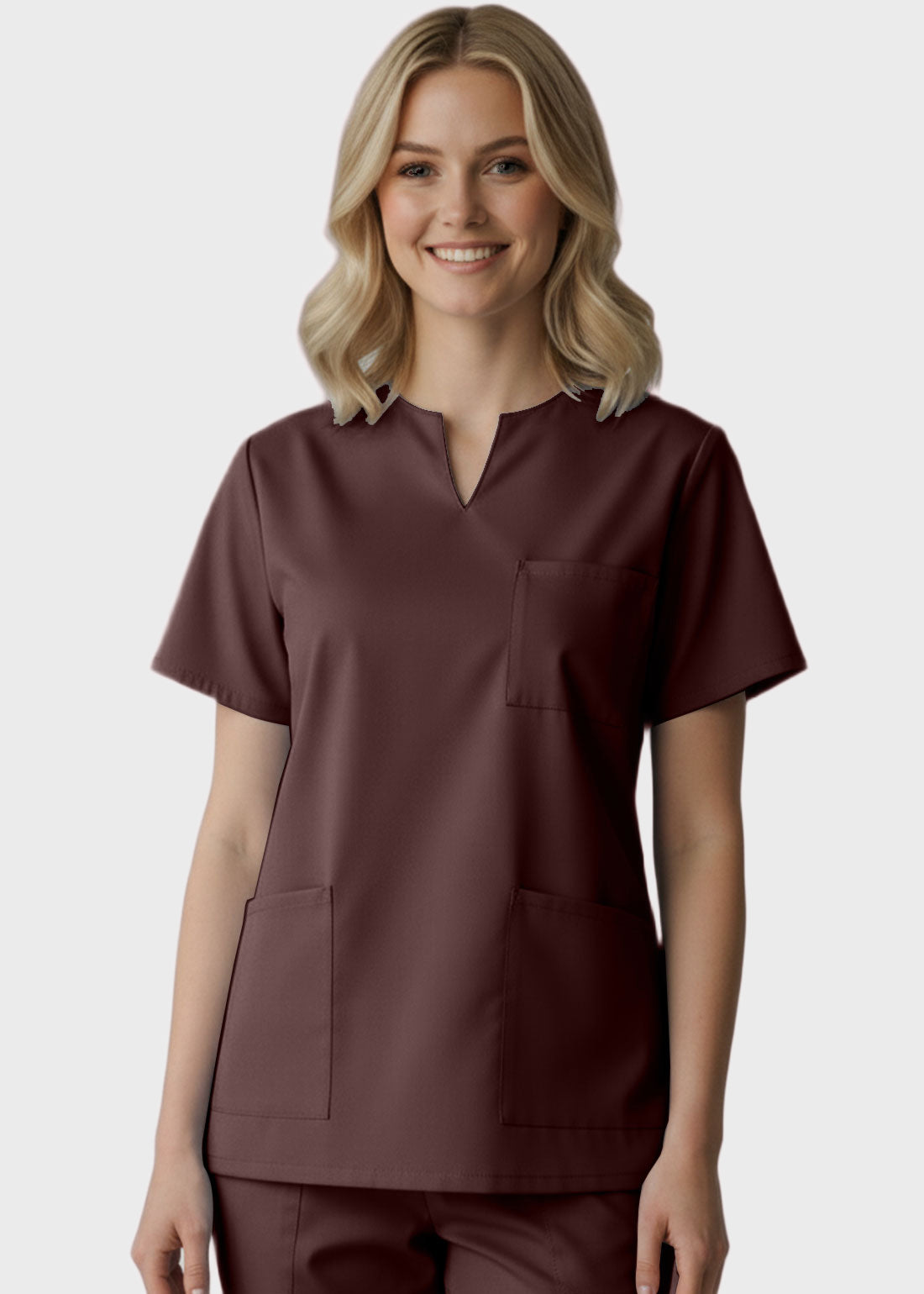Be smart and feel great in Panda Uniform 4038 Made To Order Women's Three Pocket Split Neck Nursing Scrub Top.The V-notch neckline looks smart and impressive. The dolman sleeves and side vents enhance functionality, while two roomy bottom patch pockets and one chest pocket make it easy to carry essentials. With this MTO scrub, you can choose your desired pocket, sleeve, and length as per your liking.
